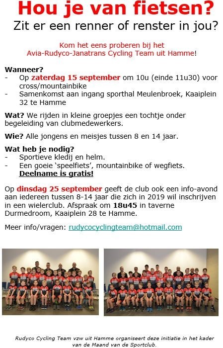 Na de aankondiging van het U17 team voor 2019 eerder, stellen we bij deze het U19 team van Avia-Rudyco-Janatrans Cycling Team voor 2019 voor. De kern voor lokale wedstrijden en gerichte interclubs zal uit een 12-tal renners bestaan, voor het overgrote deel renners die ook in 2018 al deel uitmaakten van het team. In dit team is nog 1 extra plaats beschikbaar. Daarnaast heeft het team, net als in 2018, een topsportkern samengesteld die een integraal en geintegreerd trainings-, opleidings- en wedstrijdprogramma krijgt voorgeschoteld. De sterkhouders van 2018, met oa het Belgisch kampioenenteam ploegentijdrijden, blijven de club allen trouw: Van Houte Sybren, Huys Branko, Vercauteren Thomas, Hopmans Wouter, Van Poppel Sébastien, Galle Staf, Duym Steffen, Lefevre Ruben, Van den schoor Mats, Brouwers Emile en Cosyns Milan. Daarnaast komen ook 5 U17 renners over van binnen de club: Van Hoof Manu, Delahaye Jens, Teerlinck Alexander, Thoré Rune en Van Buynder Thibaud.