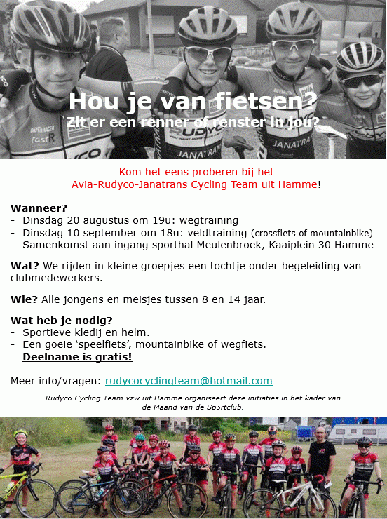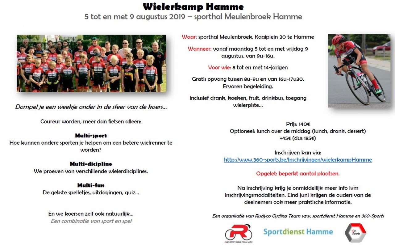 Net als vorig jaar organiseert onze club, in samenwerking met de sportdienst van Hamme en 360-Sports, terug een heus wielerkamp voor jonge renners en sportievelingen. Iedereen met een koersfiets of mountainbike is welkom. Ook nu weer zullen de jongeren op een speelse manier kennis kunnen maken met alle aspecten van de koers, maar ook met andere spel- en sportvormen. Alle info vind je terug hieronder. Inschrijven kan via volgende link: