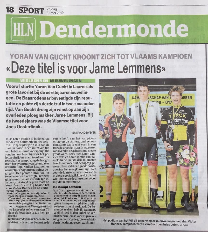 Een onwezenlijk tragisch bericht: U17 renner Jarne Lemmens is vannacht in zijn slaap overleden. Jarne was een vrolijke, positief ingestelde en leergierige jonge kerel die in onze club zijn sportieve droom nastreefde. Hij was heel graag gezien bij binnen de club bij ploegmaten en begeleiders, altijd bereid om anderen te helpen en bij te staan. We kunnen het niet vatten en we zullen Jarne ontzettend hard missen. Het verlies is onbeschrijflijk. Al onze gedachten zijn bij zijn ouders, familie en vrienden die we onze innige deelneming betuigen en die we heel veel moed en sterkte toewensen.